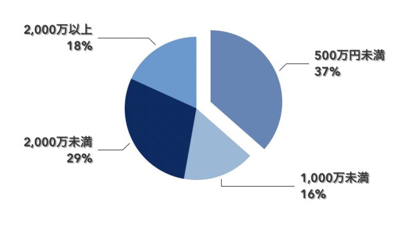 13万社ある不動産会社の資本金を見てみると、資本金が500万円未満である会社が37%を占め、1000万円未満の16%を合わせると半数以上が資本金1000万円未満となります。