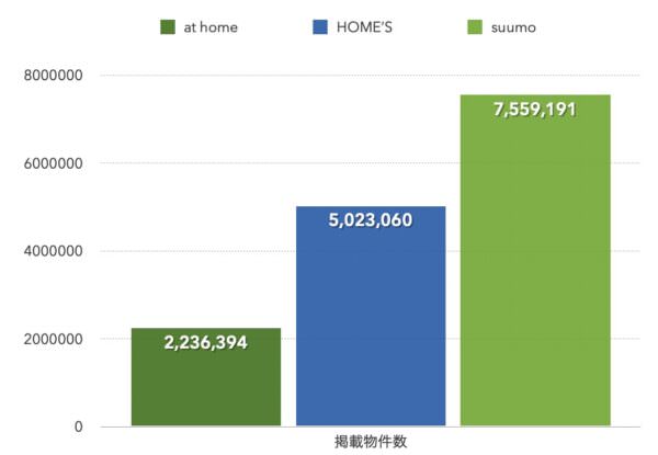 登録物件数は、suumoが7,559,191件。HOME'Sが5,023,060件。at homeが2,236,394件とsuumoの圧勝状態でした。