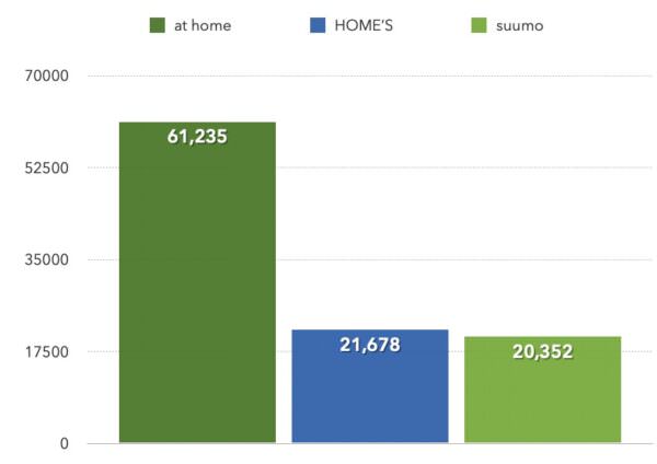 登録業者数は、at homeが61,235社。HOME'Sが21,678社。suumoが20,352社で、at homeの一人勝ち状態でした。
