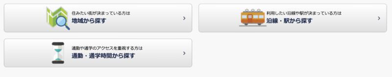従来どおり住所を基準とした"地域から探す"検索と駅や電車を基準にした"路線から探す"に加えて、会社までの"通勤時間からの検索"ができるようにしました。