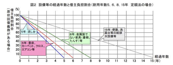 減価グラフは上記のようなもので、賃貸住宅トラブル防止ガイドラインのものです。