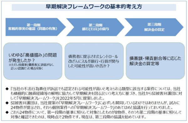 - 早期解決フレームワーク: スルガ銀行はSI被害弁護団に対し、2022年5月に「早期解決フレームワーク」を提案。これは、高値掴みの問題発生の有無、スルガ銀行・行員の関与の可能性、損害額・帰責割合に応じた解決金の算定を含む3段階の検討を提案するもの。24件の物件に対して試みられ、2件が第二段階の基準に該当。