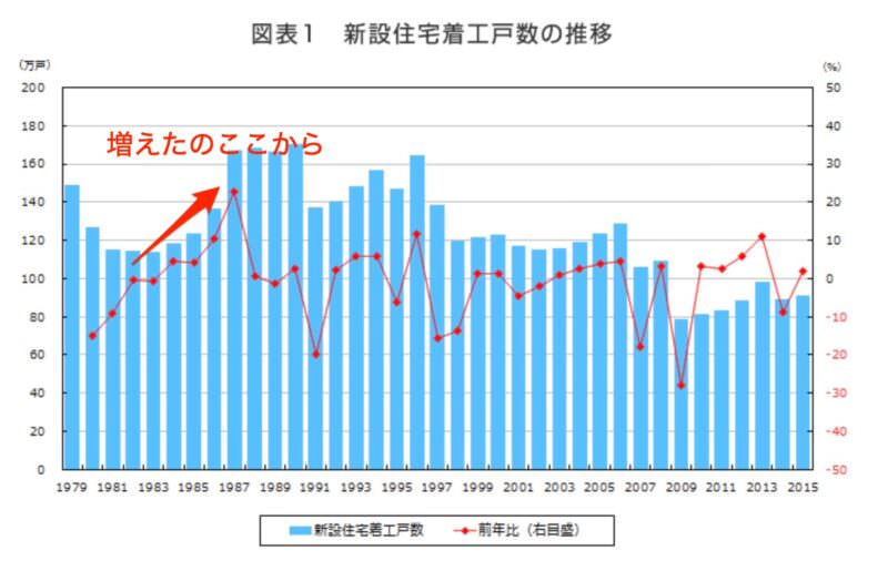 昭和56年というのは1981年になります。住宅の着工数を見てみると、大幅に戸建てが増えたのってその後からになるのです。