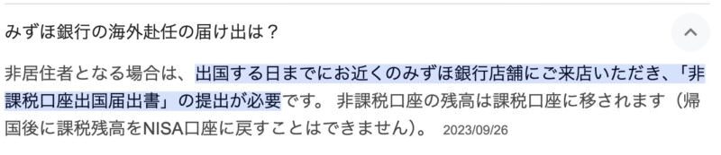 例えば、みずほ銀行では出国前までに「非課税口座出国届出書」を店舗に持ってきてと書かれています。