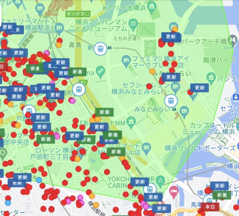 赤い丸やらオレンジ色の丸やら青い丸やらがあるのが、募集中の物件です。