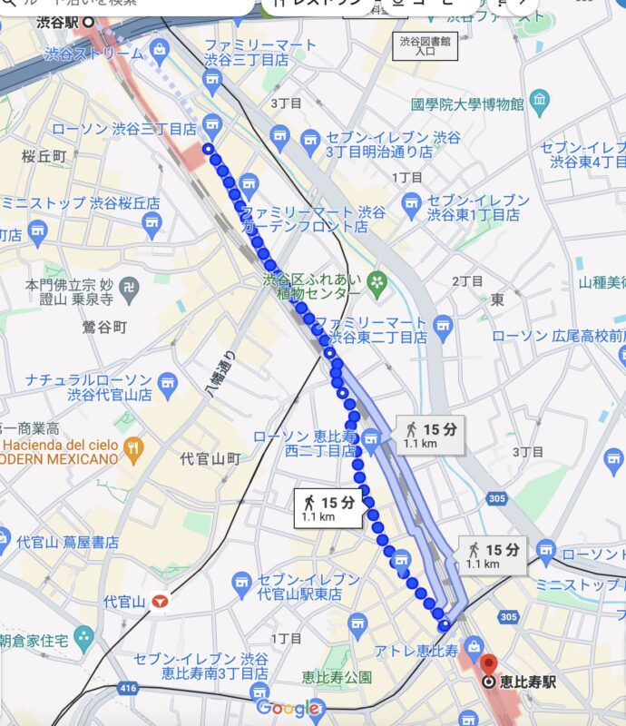 2024年のsuumoの住みたい街ランキングでは11位だった渋谷から恵比寿駅までも徒歩15分です。