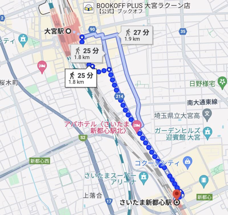 2024年の住みたい街ランキングで3位であった大宮駅から、21位であったさいたま新都心駅間はGoogleMapで徒歩25分表記です。