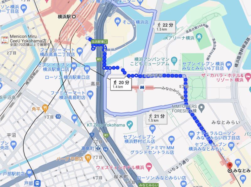 横浜駅からみなとみらい駅までは徒歩20分でした。