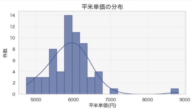 今回のデータでは、平米単価6,000円前後に最も成約が多く、このあたりが相場の中心となっています。