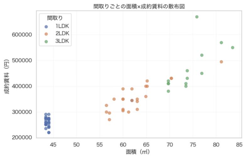 このグラフは、各部屋タイプ(区分)ごとに「面積」と「成約賃料」の関係を散布図で可視化したものです。