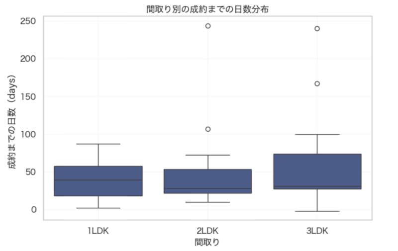 この箱ひげ図は、「各間取りごとに、入居募集から成約までにかかった日数」の分布を示しています。