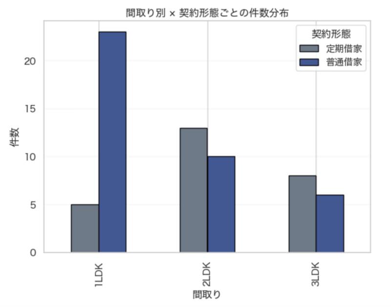 この分析は、契約期間の長さが賃料水準や成約状況にどのように影響するかをデータで確認するために行いました。