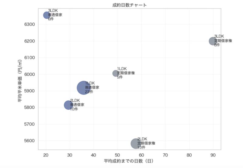 バブルが高い位置にあるほど賃料単価が高く、右側にあるほど成約までに時間がかかることを示しています。また、バブルが大きいほどそのタイプでの成約事例数が多く、主流タイプであることが分かります。