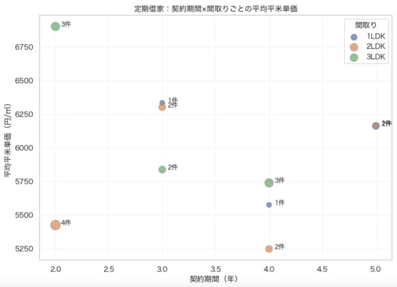 定期借家契約の場合「契約期間が長いほど、同じ間取りでも平均平米単価が高くなる傾向」が一定程度読み取れます。