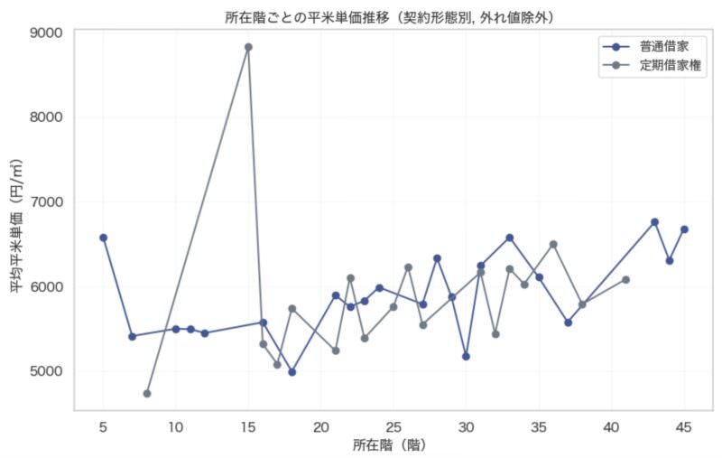 グラフからは、階数が上がるほど平米単価も緩やかに上昇する傾向が読み取れます。普通借家では1階上昇あたり平均21.8円(約0.37%)、定期借家では11.7円(約0.20%)ずつ単価が上昇しており、特に普通借家のほうが階層による単価差がやや大きい傾向が見られます。