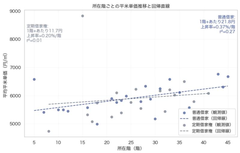 このグラフは、各所在階ごとの平均平米単価(円/㎡)を、普通借家・定期借家それぞれについて散布図と回帰直線で可視化したものです。