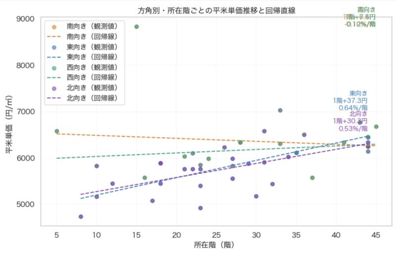 分析の結果、東向き・北向きの部屋では、階層が上がるごとに平米単価が大きく上昇する傾向がありました(東向きで+0.64%/階、北向きで+0.53%/階)。西向きは+0.12%/階と緩やかな上昇にとどまり、南向きは階数を上げても単価はほぼ横ばい、あるいはわずかに減少する傾向(-0.12%/階)が見られました。