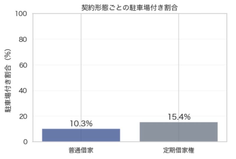 普通借家:39件中、駐車場付き4件(10.3%) 定期借家権:26件中、駐車場付き4件(15.4%)という結果でした。