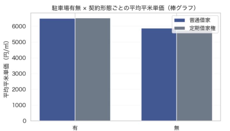 結果として、駐車場付きの部屋はどちらの契約形態でも単価が高くなっています。